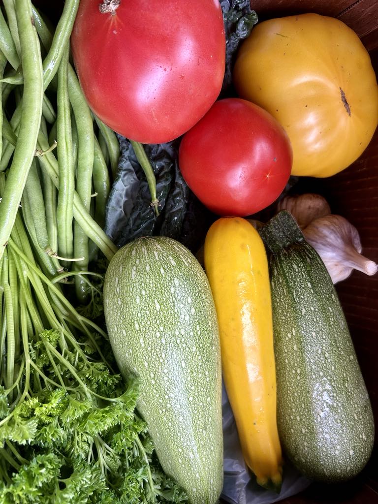 An example of a CSA share in September: green beans, heritage tomatoes, summer squash, garlic, lacinato kale, parsley and a bag of baby salad mix.