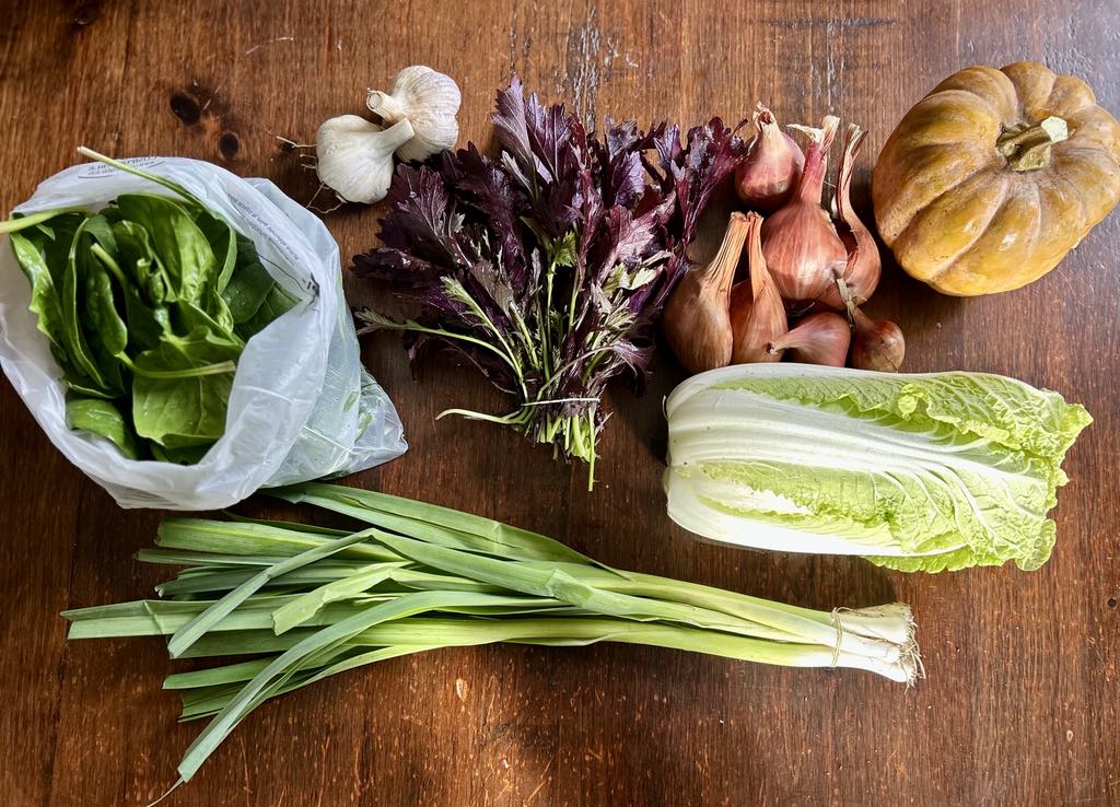 An example of a CSA share in November: spinach, garlic, mizuna, shallots, winter squash, napa cabbage and leeks.