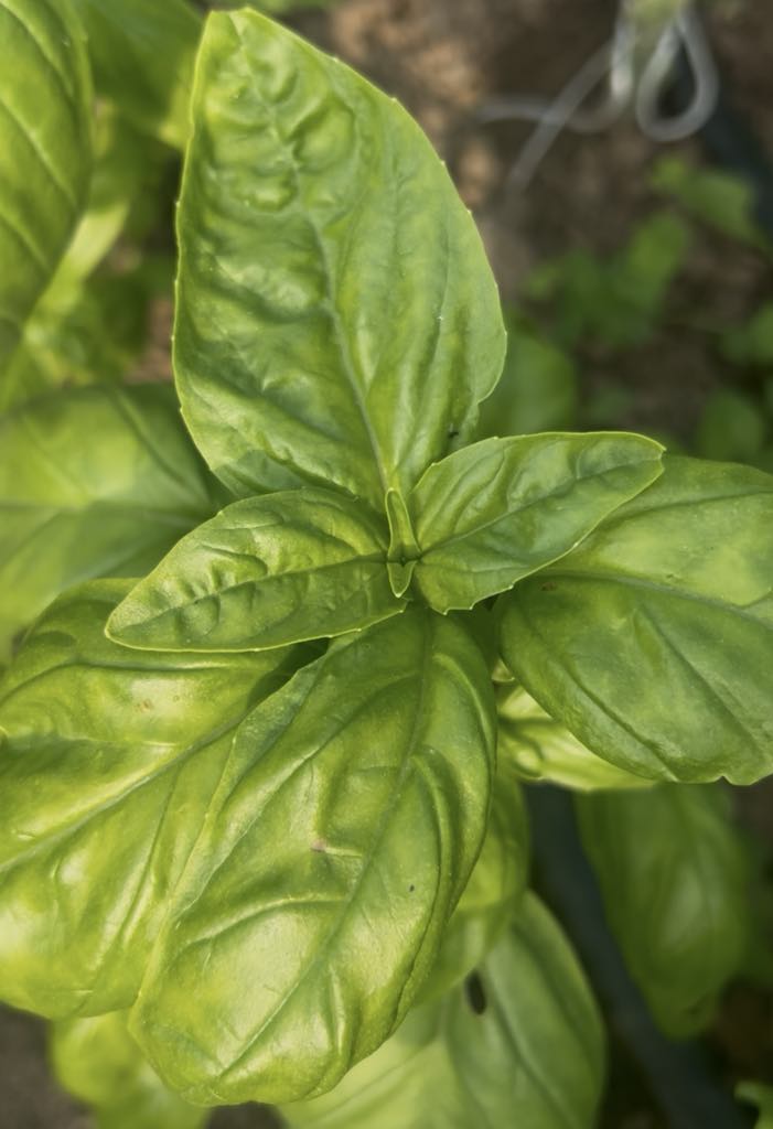 We mainly grow Italian green basil throughout the summer. Try it in salads, fresh rolls, sandwiches, lightly cooked in pastas or soups, and pesto. We also grow Tulsi basil, which is a slightly minty, lighter green variety with purple flowers. It’s often used in teas (a calming, uplifting herb) and in Asian dishes.