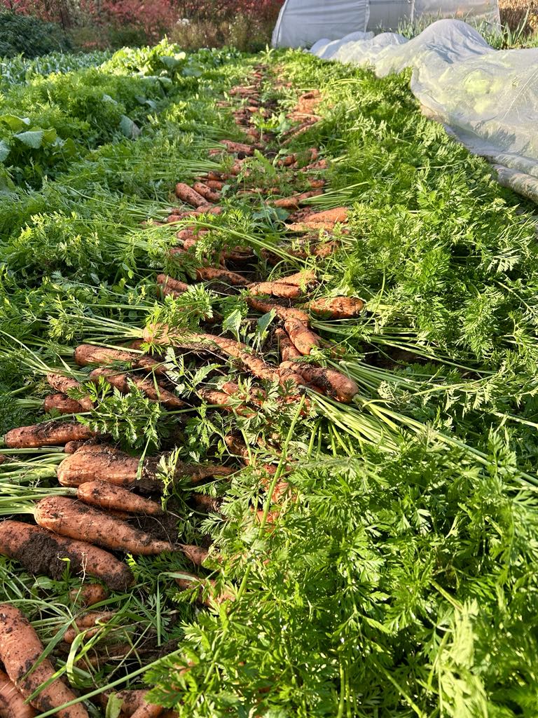 Typically, we harvest carrots and cut their tops off, which we leave in the field as a mulch to cover & protect the soil, so your carrots will come as just the roots. They can be stored in your crisper, though they do benefit from being wrapped in a cloth or plastic as well. You can also store in a container in your fridge. Carrots with a bit of dirt on them will store longer that carrots that have been scrubbed clean!